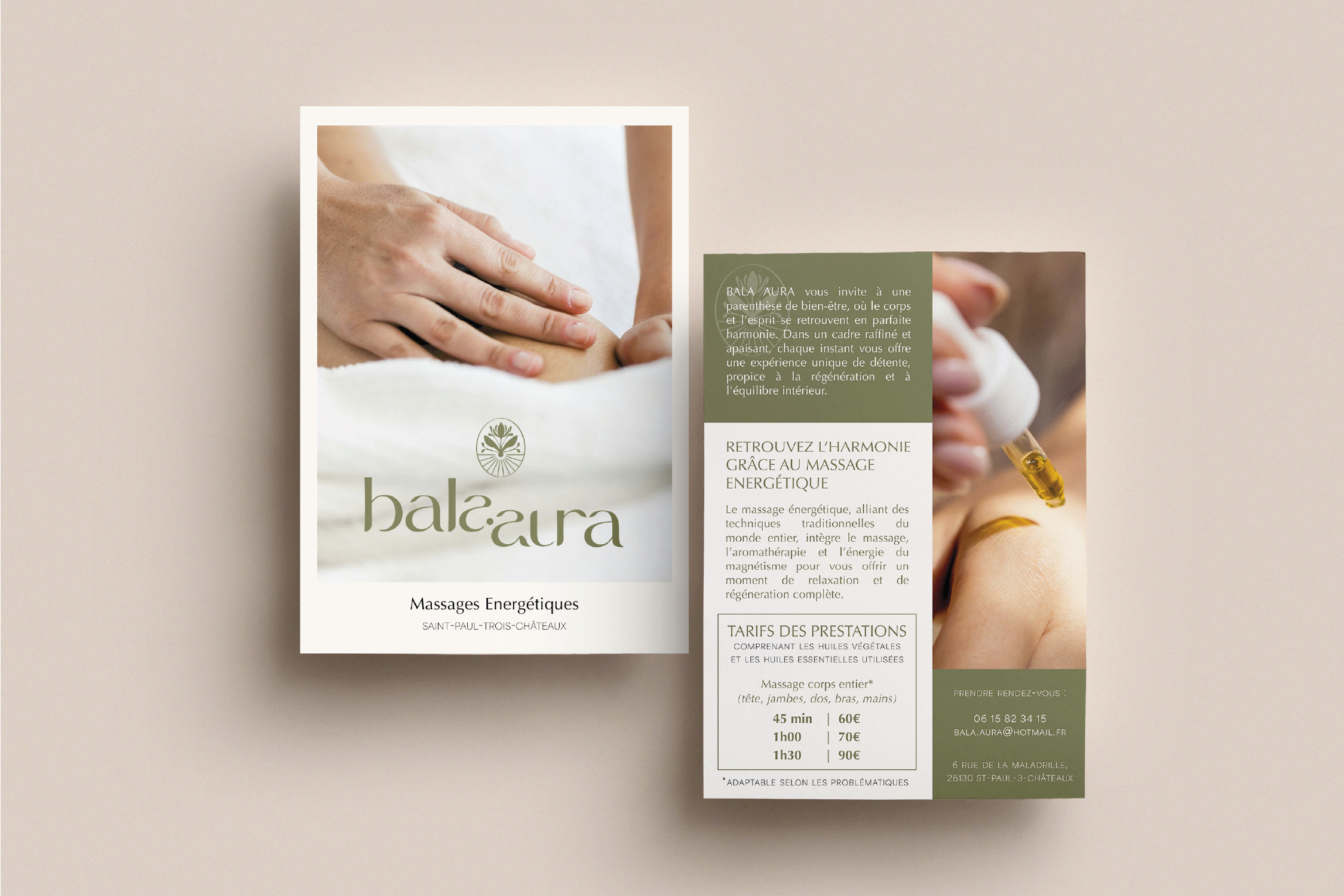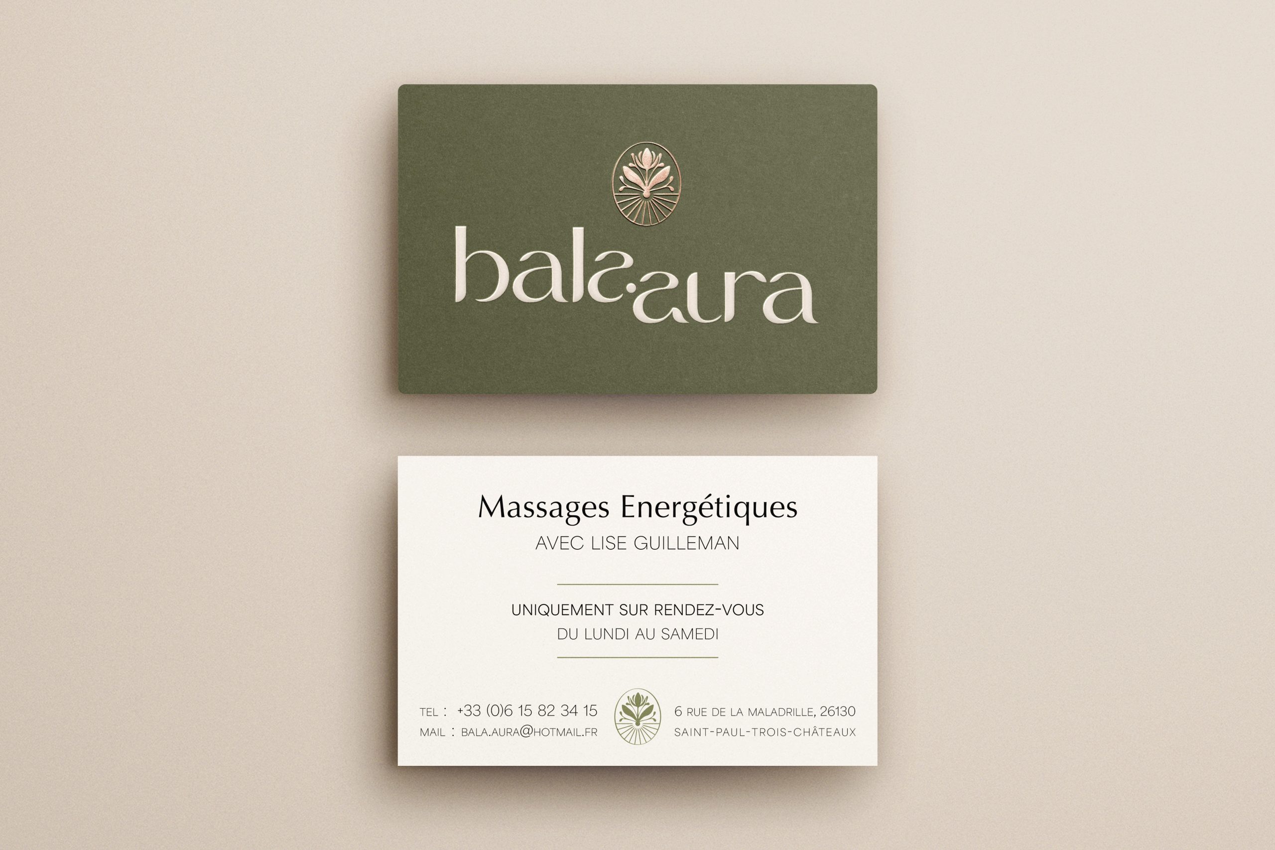 Aura représente l’énergie subtile et le rayonnement émotionnel. L’association de ces deux mots symbolise l’équilibre parfait entre vitalité physique et harmonie intérieure, lien subtilement représenté par le logo. Chaque détail visuel plonge le client dans un univers apaisant et revitalisant, reflet de l’expérience proposée chez Bala Aura.